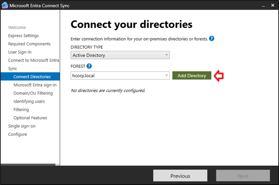 O assistente verifica a floresta que o servidor é membro e carrega, clique em Add Directory.