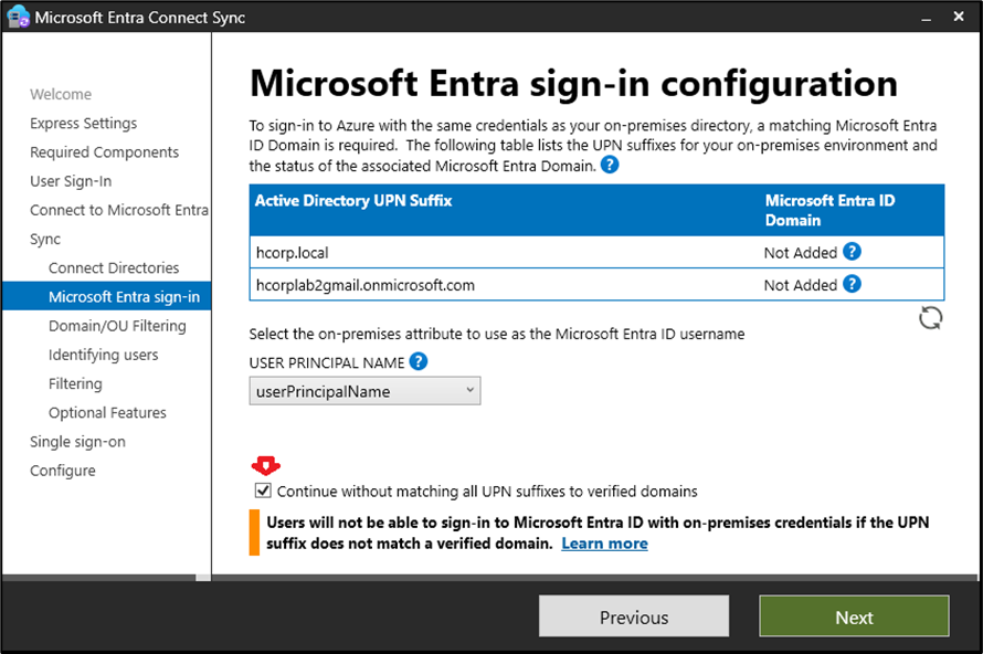 - Not added: O Microsoft Entra Connect não encontrou um domínio personalizado que correspondesse ao sufixo UPN. O sufixo UPN dos usuários deste domínio será alterado para o sufixo padrão .onmicrosoft.com se o domínio não for adicionado e verificado no Entra ID. Usuários que possuem UPN local com o sufixo @hcorp.local não poderão usar seu UPN local para entrar no Entra ID. Em vez disso, eles precisarão usar um novo UPN fornecido pelo Microsoft Entra ID, adicionando o sufixo do diretório padrão do Microsoft Entra. Por exemplo, se você estiver sincronizando usuários com o diretório do Microsoft Entra hcorplab2gmail.onmicrosoft.com, o usuário local user@hcorp.local receberá o UPN user@hcorplab2gmail.onmicrosoft.com.