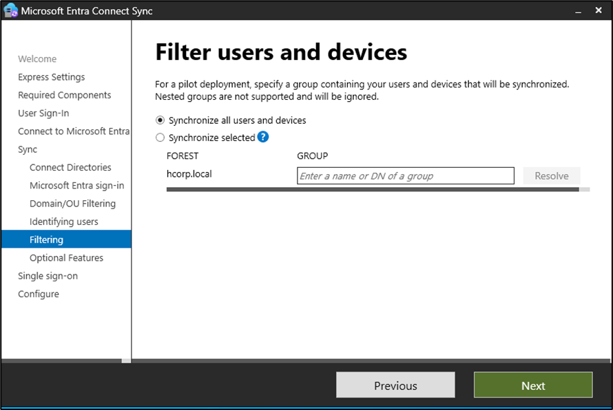Na janela Filtering é possível configurar o sincronismo de todos os usuários e dispositivos ou especificar um grupo, mantenha a opção padrão Synchronize selected, assim ele irá sincronizar todos os objetos informados nas OUs em Domain/OU Filtering. Porém caso queira filtrar quais objetos dessas OUs sejam ou não sincronizados é possível utilizar grupos e essa opção de Filtering, clique em Next.