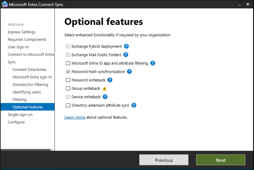 Na janela Optional Features é possível habilitar funções especificas, para mais informações sobre essas funções leia o post Diferenças entre o Microsoft Entra Connect Sync & Entra Cloud Sync, não habilitaremos nenhuma feature, clique em Next.