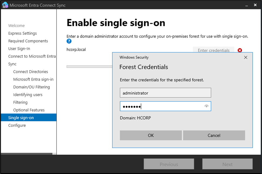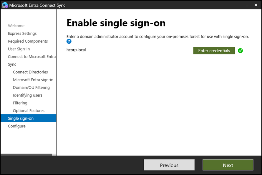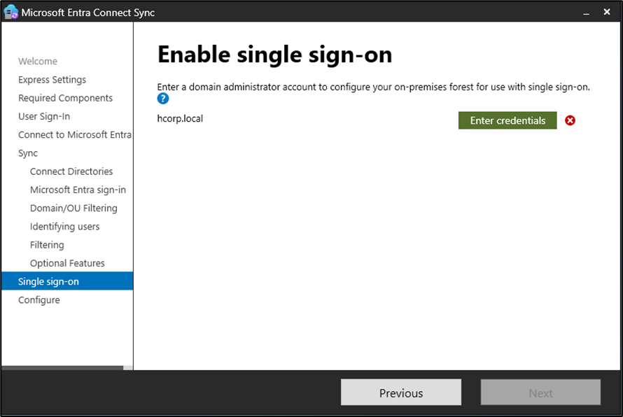 Como marcamos a opção Enable single sign-on no início do assistente é necessário inserir as credenciais de um usuário administrador do domínio, clique em Enter credentials.