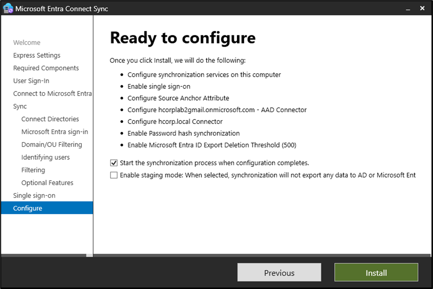Na janela Configure certifique-se que a opção Start the synchronization process When configuration completes esteja habilitada e clique em Install.
