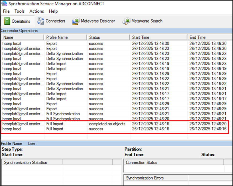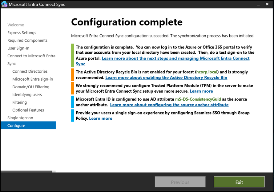 - Not verified: O Microsoft Entra Connect encontrou um domínio personalizado correspondente no Microsoft Entra ID, mas ele não foi verificado. O sufixo UPN dos usuários desse domínio será alterado para o sufixo padrão .onmicrosoft.com após a sincronização, caso o domínio não seja verificado. Neste caso, temos um domínio personalizado hcorp.local que foi adicionado ao diretório do Microsoft Entra. No entanto, ele ainda não foi verificado.