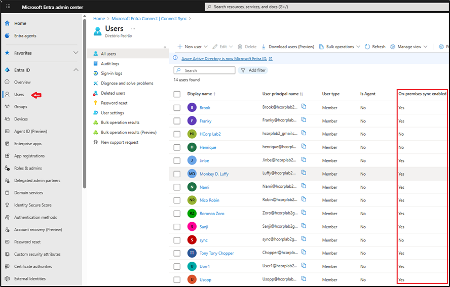 Navegue até a seção Users e verifique que os usuários locais foram sincronizados. Caso os usuários não sejam exibidos clique em Refresh. Na coluna On-premises sync enabled os usuários que estiverem com Yes são os que foram sincronizados, os usuários com No são usuários da nuvem.