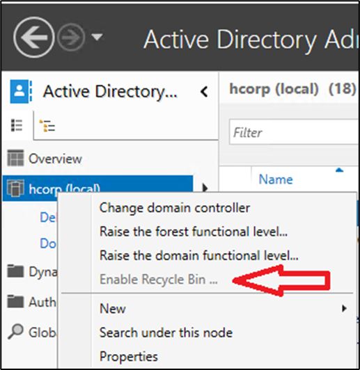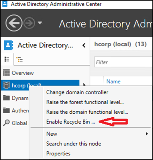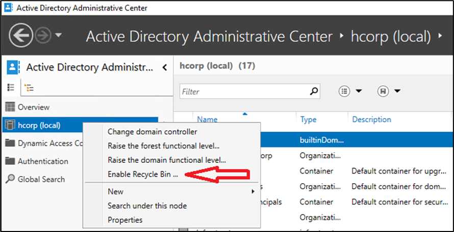 Abra o Active Directory Administrative Center, clique com o botão direito sobre o domínio e selecione a opção Enable Recycle Bin…