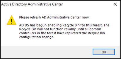 Após essas configurações a lixeira do Active Directory será habilidade e novos objetos excluídos já poderão ser restaurados.
