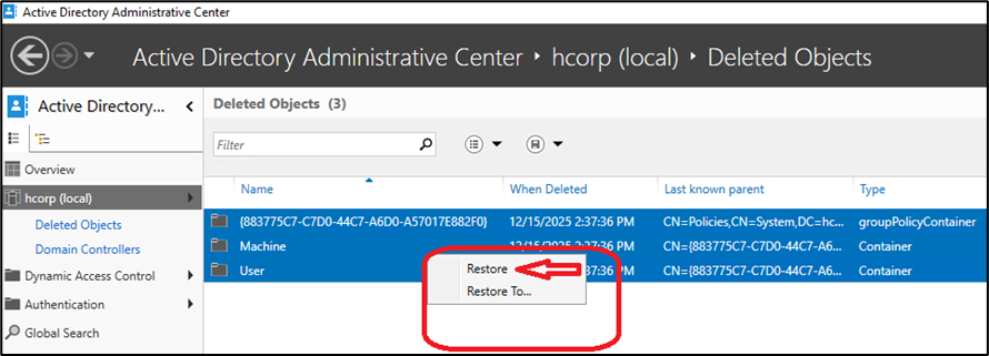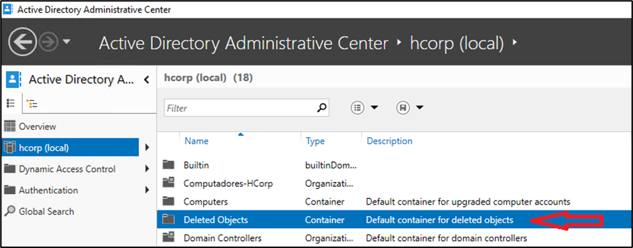 Abra o console do Active Direacoty Administrative Center e navegue até o container Deleted Object.