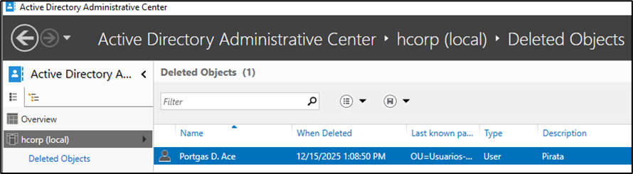 - Ace é movido para o container “CN=Deleted Objects,DC=hcorp,DC=local”