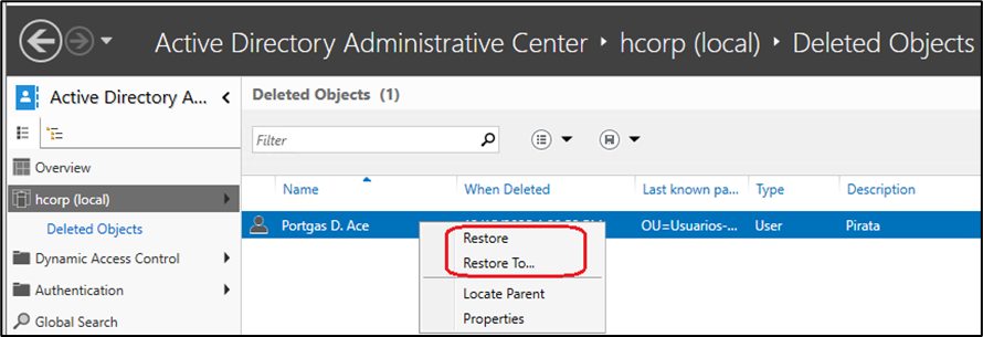 Lembre-se que você deve sempre restaurar subárvores de objetos como uma ação separada depois de restaurar os objetos pais. Ou seja, se a OU do usuário foi excluída junto do usuário, primeiro restaure a OU e depois o usuário. Ou utilize a opção Restore To…