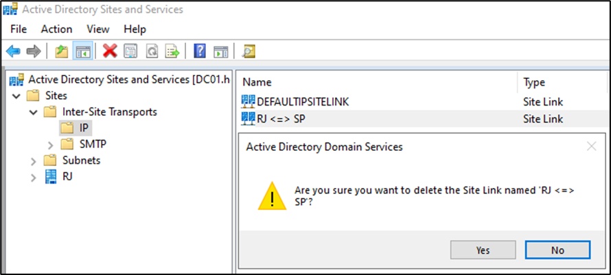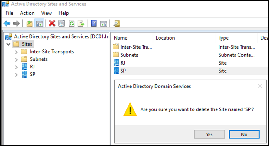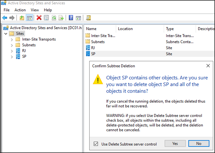 Lembrando que somente objetos da partição de domínio podem ser restaurados. Abaixo um exemplo de objetos da partição de Configuration sendo excluídos, porém não é possível restauração através da lixeira do Active Directory.