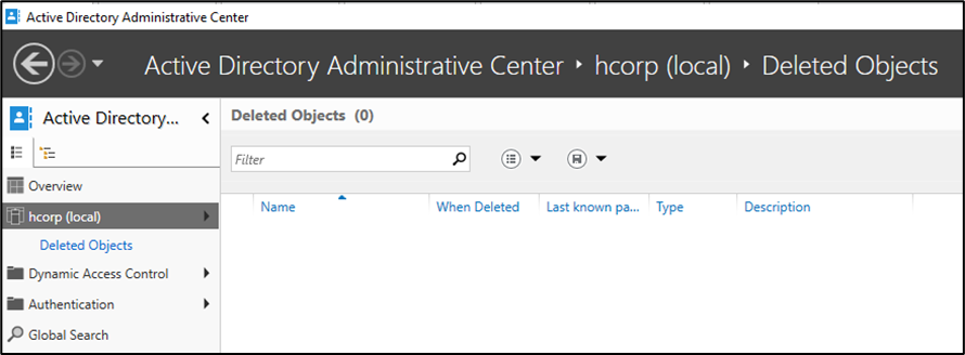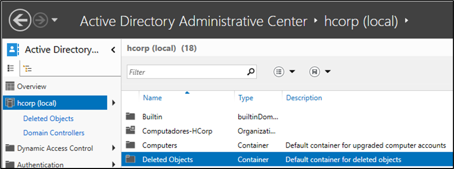 - O Active Directory Administrative Center só pode gerenciar partições de domínio, e não pode restaurar objetos excluídos de outras partições, como por exemplo a partição de Configuration de domínio ou floresta do DNS;