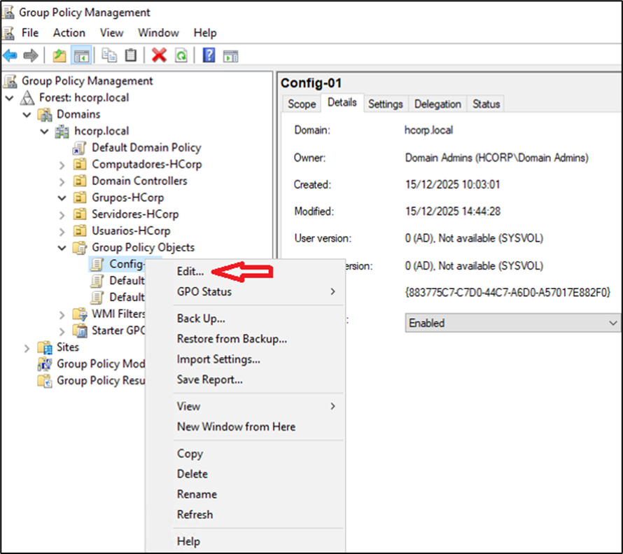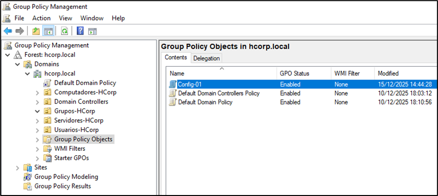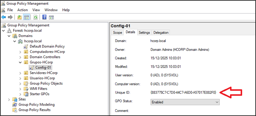 Para teste, foi criada a GPO chamada Config-01, essa GPO possui o UID {883775C7-C7D0-44C7-A6D0-A57017E882F0}