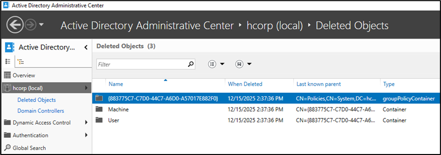 Ao verificar a lixeira do AD, podemos identificar que os objetos GPC podem ser restaurados.