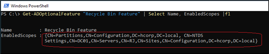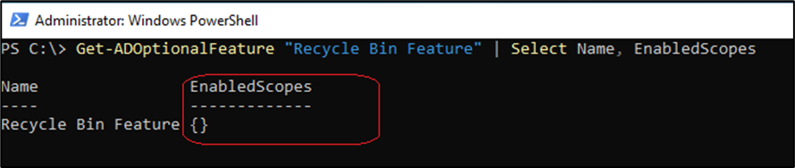 Caso a lixeira não esteja habilitada o campo EnabledScopes não exibirá nenhum DN de domínio.